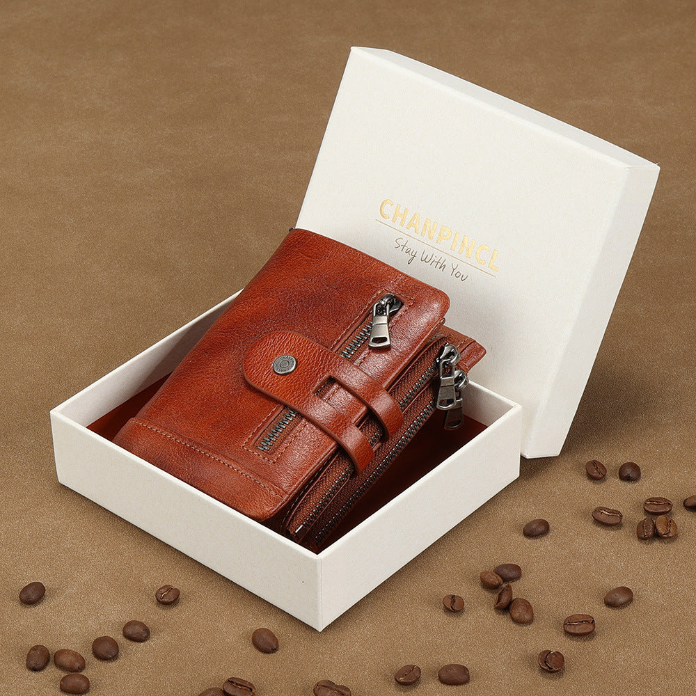 Men's Color First Layer Cowhide Double Zipper Multiple Slots Men's Wallets